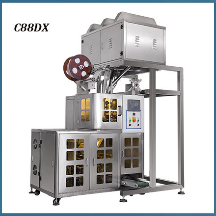 C88DX Pyramid tea bag packaging machine with premade pouch suitable for inner pyramid bag with outer pre-made pouch, for packing products from mall granules to big granules, such as loose leaf tea, herbal tea, health care tea, TieGuanYin, LongJing, DaMaoFeng, Rose Tea, Ginseng, etc.